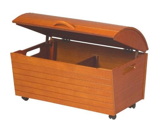 The classically styled Guidecraft treasure chest features casters for enhanced mobility. The cavernous storage area features removable dividers to allow storage customization. Features a safety hinge catch and cut-outs to prevent finger pinching. Dimensions: 32.5 x 20 x 50.
